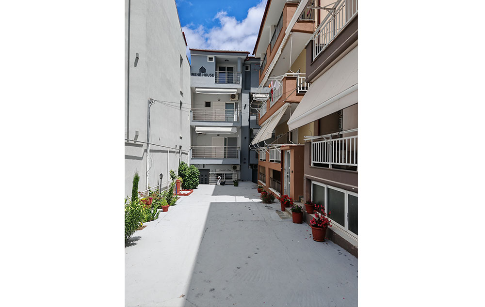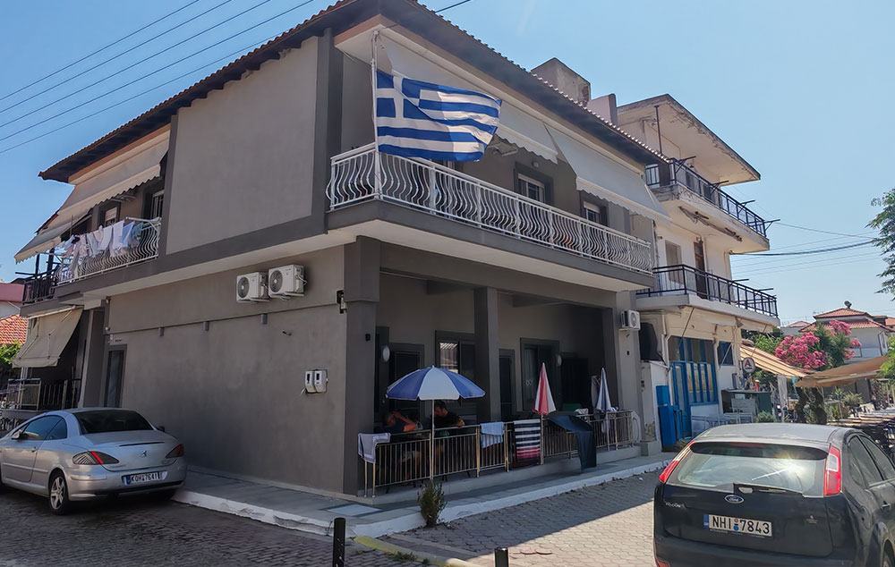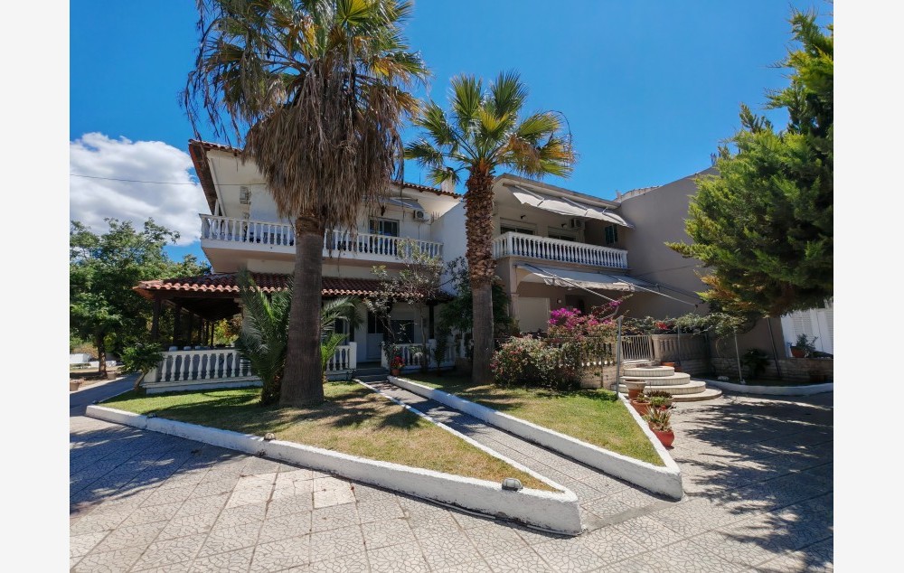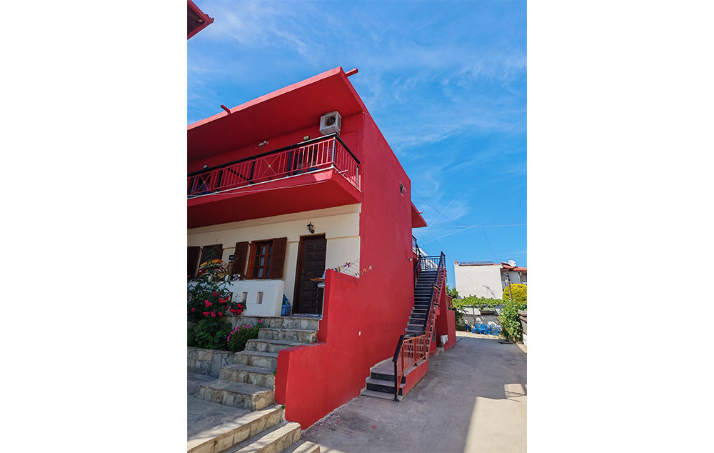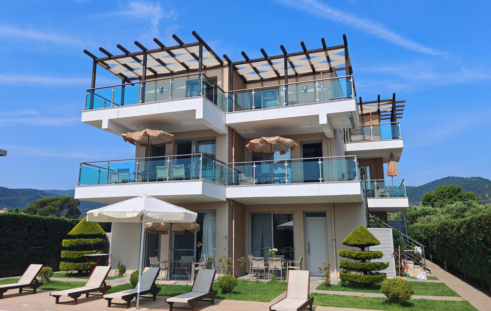 Vila Trifon sadrži studije i apartmane i nalazi se 30-ak metara od plaže u novom delu Sartija. Ova vila raspolaže četvorokrevetnim apartmanima kao i dvokrevetnim studijima. Svaki od apartmana poseduje osnovno opremljenu kuhinju: frižider, rešo, posuđe i escajg srazmerno broju ležajeva, kupatilo, terasu, TV i klima uređaj čije se korišćenje dodatno naplaćuje 5 eura po danu upotrebe. Tokom boravka gosti vile sami održavaju higijenu u apartmanima, dok se posteljina menja jednom u toku smene. U vili postoji i mogućnost korišćenja WiFi interneta.